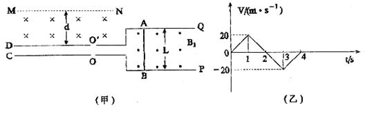 5、如图(甲)所示,两水平放置的平行金属板C、D相距很近, 上面分别开有小孔O和O′,水平放置的平行金属导轨P、Q与金属板C、D接触良好,且导轨在磁感强度为B1=10T的匀强磁场中,导轨间距L=0.50m,金属棒AB紧贴着导轨沿平行导轨方向在磁场中做往复运动,其速度图像如图(乙),若规定向右运动速度方向为正方向,从t=0时刻开始,由C板小孔O外连续不断以垂直于C板方向飘入质量为m=3.2×10-21kg,电量q=1.6×10-19C的带正电的粒子(设飘入速度很小,可视为零),在D板外侧有以MN为边界的匀强磁场B2=10T,MN与D相距d=10cm,B1与B2方向如图所示(粒子重力及其相互作用不计),求