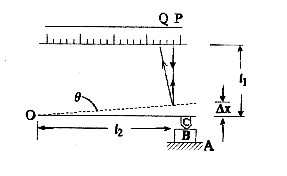 6、下图为测定微小厚度变化的装置示意图,在工作台A上放标准件B,上面压杆C顶部有一小平面镜M,一束光线从标尺垂直射向平面镜M,反射后落在标尺刻度P处(通常恰调到零点)。若撤去B,换上待测工件,如待测工件标准件厚Δx,则压杆C顶端的小平面镜就会绕转轴O旋转一微小角度,使来自标尺的光束反射后落在Q处,已知平面镜至标尺长11,平面镜中心至O轴为l2,PQ=Δs。求待测工件与标准件的厚度差Δx。
