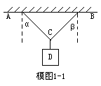 1.重力为G的重物D处于静止状态。如模图1-1所示,AC和BC 两段绳子与竖直方向的夹角分别为α和β。α+β<90°。现保持α角不变,改变β角,使β角缓慢增大到90°,在β角增大过程中,AC的张力T1,BC的张力T2的变化情况为 [ ]