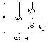 11.如模图1-7所示,A、B、C三只灯的阻值相等,都是R,不考虑电阻值随温度的变化。为了使它们通电后的实际电功率之比PA∶PB∶PC=16∶9∶1,应将与C灯并联的电阻箱的阻值调为 [ ]