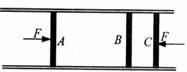 如图所示,圆筒形气缸中有A、B、C三个可无摩擦滑动的活塞,在相邻的两个活塞之间分别封闭着空气a和b,当三个活塞静止时,空气a、b的体积之比为3:1。现对活塞A、C分别施加大小相等、方向相反的力F,使活塞A向右移动3.0cm,活塞C向左移动3.0cm,若温度保持不变,待三个活塞再度静止时,活塞B向________(填“左”或“右)移动了_________cm。