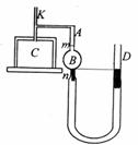 (2)关闭K往上举D,使左管水银面达到刻度m处。刻度m与球型容器B上端开口平齐。这时测得B、D两管内水银面的高度差h1=12.5cm。