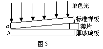 如图5所示是用干涉法检查某块厚玻璃板的上表面是否平的装置。所用单色光是用普通光源加滤光片产生的。检查中所观察到的干涉条纹是由下列哪两个表面反射的光线叠加而成的?