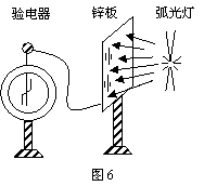 在演示光电效应的实验中,原来不带电的一块锌板与灵敏验电器相连,用弧光灯照射锌板时,验电器的指针张开了一个角度,如图6所示,这时
