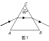 截面为等腰三角形的玻璃棱镜ABC,顶角B为60°,入射AB面的光线,通过棱镜的光路如图7所示,其中折入棱镜的光线与底面AC平行。若出射光线的偏向角为30°,则玻璃的折射率为________________。
