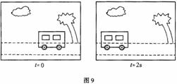 23.公共汽车在平直的公路上匀变速行驶时,固定于路旁的照相机相隔两秒连续两次对其拍照,得到清晰照片,如图9所示。分析照片得到如下结果:①在两张照片中,悬挂在公共汽车顶棚上的拉手均向后倾斜相同角度;②对间隔2s所拍的照片进行比较,可知汽车在2s内前进了12m。根据这两张照片,下列分析正确的是()