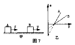 、μB。现用平行于水平面的拉力F分别拉物体A、B,所得两物体的加速度a与F的关系图线分别如图7(乙)所示,则根据a-F图线可得出的正确结论是