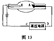 15.(12分)图13为伦琴射线管的示意图,K为阴极钨丝,发射的电子的初速度为零,A为对阴极(阳极),当AK之间加直流电压U=30kV时,电子被加速打在对阴极A上,使之发出伦琴射线,设电子的动能全部转化为伦琴射线的能量,试求: