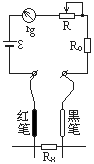 下图为万用表欧姆挡的原理示意图,其中电流表的满偏电流为300μA,内阻rg=100W,调零电阻最大阻值R=50kΩ,串联的固定电阻R0=50Ω,电池电动势ε=1.5V。用它测量电阻Rx,能准确测量的阻值范围是( )