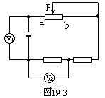 如图19-3所示的电路中,电源的电动势为ε,内阻为r。当可变电阻的滑片P向b点移动时,电压表V1的读数U1与电压表V2的读数U2的变化情况是( )。