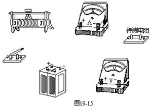 25.图19-15为用伏安法测量一个定值电阻阻值的实验所需的器材实物图,器材规格如下: (1)待测电阻Rx(约100欧);; (2)直流毫安表(量程0-10毫安,内阻50欧); (3)直流电压表(量程0-3伏,内阻5千欧); (4)直流电源(输出电压4伏,内阻可不计); (5)滑动变阻器(阻值范围0-15欧,允许最大电流1安); (6)电健一个,导线若干条. 根据器材的规格和实验要求,在本题的实物图上连线。