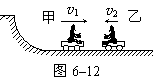如图6–12所示,甲、乙两人各乘一辆冰车在山坡前的水平冰道上游戏,甲和他的冰车总质量为m1=40kg,从山坡上自由下滑到水平冰道上的速度v1=3m/s.乙和他的冰车总质量m2=60kg,以大小为v2=0.5m/s的速度与迎面来的甲相碰.两车不宜直接接触,为此甲必须用力将乙推开.问相碰时甲的推力对乙做功在什么范围内才能使两车分开,并且不再相碰?摩擦力忽略不计.