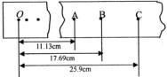 为三个计数点,打点计时器通以50Hz的交流电,用最小刻度为1mm的刻度尺,测量得OA=11.13cm,OB=17.69cm,OC=25.9cm。这三个数据中不符合有效数字要求的是__________,应该写成 7cm。在计数点A和B之间、B和C之间还有一个点,重锤的质量为m,根据以上数据,当打点针打到B点时重锤的重力势能比开始下落时减少了_________,这时它的动能是___________;(g=9.8m/s2)