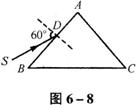 16.(12分)如图6-8所示,一等腰直角棱镜,放在真空中,AB=AC=d。在棱镜侧面AB左方有一单色点光源S,从S发出的光线SD以60°的入射角从AB侧面中点射入,当它从AC侧面射出时,出射光线偏离入射光线的偏向角为30°,若测得此光线传播的光从光源到棱镜侧面AB的时间跟在棱镜中传播时间相等,那么点光源S到棱镜AB侧面的垂直距离是多少?