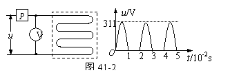 **7、(4分) 如图41-2所示,左图所示是某种型号的电热毯的电路图,电热毯接在交变电源上,通过装置P使加在电热丝上的电压的波形如右图所示.此时接在电热丝两端的交流电压表的读数为