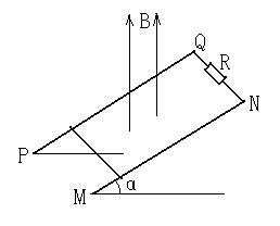 **20.(13分)如图所示,两根平行光滑金属导轨PQ和MN相距d=0.5m,它们与水平方向的倾角为α(sinα=0.6),导轨的上方跟电阻R=4Ω相连,导轨上放一个金属棒,金属棒的质量为m=0.2kg、电阻为r=2Ω.整个装置放在方向竖直向上的匀强磁场中,磁感应强度B=1.2T.金属棒在沿斜面方向向上的恒力作用下由静止开始沿斜面向上运动,电阻R消耗的最大电功