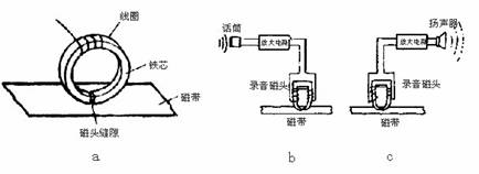 8.普通磁带录音机是用一个磁头来录音和放音的,磁头结构示意如图Ⅰ-6(a)所示,在一个环形铁芯上绕一个线圈,铁芯有一个缝隙,工作时磁带就贴着这个缝隙移动,录音时磁头线圈跟话筒、放大电路(亦称微音器)相连(如图Ⅰ-6(b)所示);放音时,磁头线圈改为跟扬声器相连(如图Ⅰ-6(c)所示).磁带上涂有一层磁粉,磁粉能被磁化且留下剩磁.微音器的作用是把声音的变化转化为电流的变化;扬声器的作用是把电流的变化转化为声音的变化.由此可知①录音时线圈中的感应电流在磁带上产生变化的磁场,②放音时线圈中的感应电流在磁带上产生变化的磁场,③录音时磁带上变化的磁场在线圈中产生感应电流,④放音时磁带上变化的磁场在线圈中产生感应电流.以上说法正确的是
