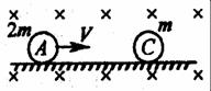 16.(12分)如图所示,在光滑的绝缘水平面上方,有垂直纸面向里的匀强磁场,一质量为m、不带电的钢球G静止放在平面上,另一质量为2m、与C球等大的带有电量+q的钢球A,以速度V向C球运动,与C碰撞前钢球A对水平面无压力,与C球发生正碰后,C球对水平面恰好无压力,求碰后瞬间A球对水平面的压力大小为多少。