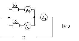 如图3所示电路中,电流表A1与A2为相同的毫安表(内阻不能忽略),当电路两端按入一恒定电压的电源时,A1表的示数为5mA,A2表的示数为3mA,现将A2表改接在R2所在的支路上,如图中虚线所示,图中电表