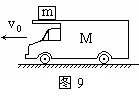 (10分)如图9所示,-辆长L=2.0m,高h=0.8m,质量为M=12Kg的平顶车,车顶面光滑,在牵引力为零时,仍在向前运动.设车运动时受到的阻力与它对地面的压力成正比,且比例系数μ=0.3。当车速为v0=7m/s时,把一质量为1Kg的物块(视为质点)轻轻放在车顶的前端。问物块落地时,落地点距车前端的水平距离多大?
