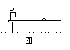 (12分)如图11所示,光滑水平桌面上放着一个长木板A,其上有一个可遥控的滑块B,滑块与木板的质量均为0.8kg,滑块与木板间的动摩擦因数μ=0.2,开始时A、B均静止,突然启动滑块B使其得到4.8N的向右的牵引力,0.5s后又用遥控解除滑块B受到的牵引力,木板A到达桌边缘前,A、B已达到共同速度。求A、B的共同速度。(g=10m/s2)