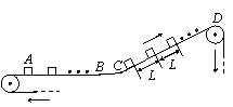 (20分)一传送带装置示意图如图,其中传送带经过AB区域时是水平的,经过BC区域时变为圆弧形(圆弧由光滑模板形成,为画出),经过CD区域时是倾斜的,AB和CD都与BC相切。现将大量的质量均为m的小货箱一个一个在A处放到传送带上,放置时初速为零,经传送带运送到D处,D和A的高度差为h。稳定工作时传送带速度不变,CD段上各箱等距排列,相邻两箱的距离为L。每个箱子在A处投放后,在到达B之前已经相对于传送带静止,且以后也不再滑动(忽略经BC段时的微小滑动)。已知在一段相当长的时间T内,共运送小货箱的数目为N。这装置由电动机带动,传送带与轮子间无相对滑动,不计轮轴处的摩擦。求电动机的平均输出功率P。