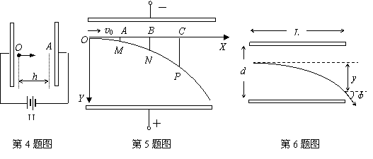 5、真空中有一束电子流,以一定的速度V0沿着与场强垂直的方向自O点进入匀强电场,如图所示。以O点为坐标原点,x轴垂直于电场方向。如果沿x轴取OA=AB=BC,分别自A、B、C点作跟y轴平行的直线与径迹交于M、N、P三点,那么: