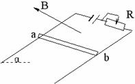 7.如图10所示,宽为L的框架和水平面的夹角为α,处于磁感应强度为B的匀强磁场中,磁场的方向垂直于框架平面。导体棒ab的质量为m,置于金属框架上时向下匀加速滑动,导体棒与框架间的最大静摩擦力为f。为使导体棒静止在框架上,将电动势为E的电源接入电路中,框架与导体棒的电阻不计,求需要接入的滑动变阻器的阻值范围。