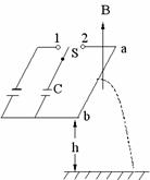 13.如图5所示金属杆ab的质量m=5×10-3Kg,放在宽为L=1m、水平光滑的两平行金属导轨的一端上,离地的高度h=0.8m。电源电动势E=16V,电容器电容C=200μF,磁感应强度B=0.5T,方向竖直向上。开关S先扳向1,然后扳向2,杆ab被抛到地面上离抛出位置的水平距离S=6.4×10-2m处。求杆ab被抛出后电容器所带的电量。