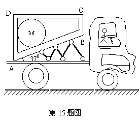 15、(11分)为了在平直公路上运送一个质量M=1000kg的圆柱形容器,把它放置于卡车的专用支架ABCD上,AB斜面倾角为370,CD保持水平,AD保持竖直。静止时容器顶部与CD有一小的间隙,如图所示,求以下两种情况中的容器对AD、AB和CD的压力(摩擦不计,sin370=0.6,cos370=0.8,g取10m/s2)