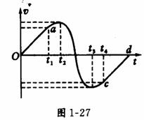 9.一个小孩在蹦床上做游戏,他从高处落到蹦床上后又被弹起到原高度,小孩从高处开始下落到弹回的整个过程中,他的运动速度随时间变化的图象如图1-27所示,图中只有Oa段和cd段为直线.则根据此图象可知,小孩和蹦床相接触的时间为 ( )