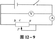 13.(7分)在测电池的电动势和内阻的实验中,某同学连好电路如图12-9所示,合上开关后,发现将滑动变阻器的触头P由a缓慢向b滑动时,开始电压表示数一直不变,电流表示数为零,直到触头滑过c点时,电压表示数突然变小,电流表示数突然变大,这个故障的原因是___________。故障排除后,测出几组数据如下表,请根据这些数据画出U-I图线,再根据图线读出电池电动势E=___________,内阻r=___________。