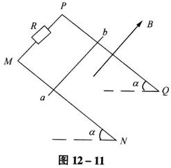 16.(12分)如图12-11所示,MN、PQ是两根足够长的固定光滑平行金属导轨,两导轨间的距离为L,导轨平面与水平面的夹角为α,在整个导轨平面内都有垂直于导轨平面斜向上方向的匀强磁场,磁感强度为B,在导轨的M、P端连接一个阻值为R的电阻,一根垂直于导轨放置的金属棒ab,质量为m,从静止释放开始沿导轨下滑,求ab棒的最大速度(导轨和金属棒的电阻不计)。