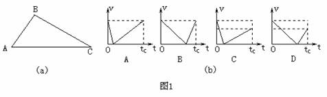 有两个光滑固定斜面AB和BC,A和C两点在同一水平面上,斜面BC比斜面AB长,如图1所示。一个滑块自A点以一定的初速度上滑,到达B点时速度减小为零,紧接着滑块沿BC滑下。设滑块从A点到C点的总时间是tC,在图1(b)中的四个图中,正确表示滑块速度大小随时间变化规律的是
