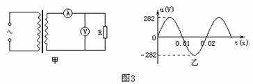 4.理想变压器连接电路如图3(甲)所示,当输入电压波形如图3(乙)时,已知原副线圈匝数比10∶1,安培表读数2A,则