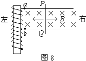 8.在一根软铁棒上绕有一组线圈, a、c是线圈的两端, b为中心抽头。把a端和b抽头分别接到两条平行金属导轨上, 导轨间有匀强磁场, 方向垂直于导轨所在平面并指向纸内, 如图6所示。金属棒PQ在外力作用下以图示位置为平衡位置左右作简谐运动, 运动过程中保持与导轨垂直, 且两端与导轨始终接触良好。下面的过程中a、c点的电势都比b点的电势高的是