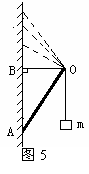 9.竖直墙壁用轻杆OA、OB把质量m的物体悬挂在O点(如图5所示)。现保持O点位置不动,改变OB的长而使B点缓慢沿墙上移,在B点上移的过程中,OA、OB的作用力FA和FB的大小变化为( )