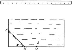,OM=1dm,在容器中央正上方1dm处水平放置一足够长的刻度尺。求光源S发出的光线经平面镜反射后,照射到刻度尺上的长度。(不考虑容器侧壁和液面的反射)