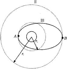 的更高的圆轨道Ⅱ,必须先加速进入一个椭圆轨Ⅲ,然后再进入圆轨道Ⅱ。已知飞行器在圆轨道Ⅱ上运动速度大小为v,在A点时通过发动机向后喷出一定的质量气体使飞行器速度增加到v′,进入椭圆轨道Ⅲ,设喷出的气体的速度为u,求:
