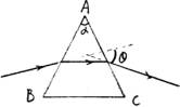 16、一主截面是等腰三角形的棱镜,其顶角为α,入射光线由AB面射入,经两次折射后出射光线由AC面射出,偏折角为θ,光线在棱镜内传播时恰与底面平行,如图,则棱镜的折射率n等于_______________________________。