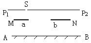20、图中AB表示一直立的平面镜,P1P2是水平放置的米尺(有刻度的一面朝着平面镜),MN是屏,三者相互平行。屏MN上的ab表示一条竖直的缝(即ab间是透光)。某人眼睛紧贴米尺上的小孔S(其位置见图),可通过平面镜看到米尺的一部分刻度,试在本题的图上用三角板作图求出可看到的部位,在P1P2上把这部分涂以标志。