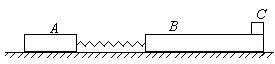 (15分)如图所示,在光滑水平面上有物块A和B,物块C(大小不计)放在B的右边缘,开始时用手使AB之间压缩一根轻弹簧(弹簧与物块A、B不粘连),然后突然放手使A、B各自向左、右弹射出去,在B向右运动过程中,C从B的右端恰好运动到B的左端并以共同的速度运动。已知弹簧被压缩时的弹性势能E=16J,三物块质量均为