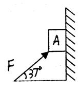 17、如图所示,物体A重10N,物体与竖直墙的动摩擦因系数为0.4,用一个与水平方向成37°角的力F作用在物体上,要使物体A沿墙作匀速运动则该力的大小为多大?(g取10m/s2,sin37°=0.6)(10分)