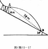 20、(12分)如图3-17所示,滑雪运动员从高台上滑下,滑到滑道端点A处时沿水平方向滑出,落到倾角为30°的斜坡上B点。已知A点到斜坡的竖直距离为4m,AB=78m,不计空气阻力,取 g=10m/s2,求运动员离开A处时的速度V0。