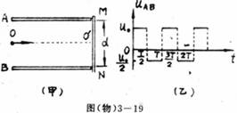 22、(13分)如图3-19甲所示,平行金属板A和B的距离为d,它们的右端安放着垂直于金属板的靶MN,现在A,B板上加上如图-19乙所示的方型波电压,电压的正向值为u0,反向电压值为u0/2,且每隔T/2换向1次,现有质量为m的带正电且电量为q的连续粒子束从AB的中点O以平等于金属板的方向OO′射入。设粒子能全部打在靶上而且所有粒子在AB间的飞行时间均为T,不计重力的影响。试问:(1)在距靶MN的中心O′点多远的范围内有粒子击中?(2)要使粒子能全部打在靶MN上,电压u0的数值应满足什么条件?(写出u0,m,d,q,T的关系式即可)