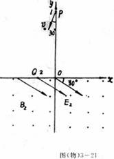 24、(15分)如图3-21所示,在位于竖直平面内的直角坐标系中,第Ⅱ象限区域内有一沿+y方向的匀强电场,场强E1=50N/C还有一个与x轴相切于Q点的圆形有界匀强磁场,磁感强度B1=500T,方向垂直于纸面向里。在x轴的下方区域内有垂直于纸面向外的匀强磁场,磁感强度B2=2.5T,还有一个位于坐标平面的匀强电场,方向如图所示。今有一个质量m=1.0×10-5kg、电量q1=+2.0×10-6C的带电小球,从y轴上的P点以初速v0=40m/s斜射入第Ⅱ象限,经过圆形有界磁场时偏转了60°角,恰与x轴上静止于Q点的另一个质量仍为m的带电小球2相碰,小球2的带电量q2=-6×10-6C,两球相碰后粘合在一起,问(1)在第Ⅱ象限内圆形磁场区的最小半径多大?(2)欲使碰后小球沿直线运动,x轴下方匀强电场的场强E2的大小应为多少?