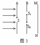 11.如图3是杨氏实验装置示意图,图中太阳光投射到单孔屏A上,此单孔S的作用是___,后面是一双孔屏,两孔距离很____, 且与前一个小孔距离___,其作用是保证任何时刻从前一小孔 发出的光都会同时传到这两个小孔,这两个小孔即为_____.