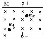 20.如图所示静止在负极板附近的带负电的微粒m1在MN间突然加上电场时开始运动,水平匀速地击中速度为零的中性微粒m2后粘合在一起恰好沿一段圆弧运动落到N极板上,若m1=9.995×10-7kg带电量q=-10-8c,电场强度E=103V/m,磁感应强度B=0.5T,求m1击中m2前的高度, m1击中m2前的瞬间速度, m2的质量及m1和m2粘合体做圆弧运动的半径.
