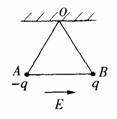 有三根长度皆为L=1.00m的不可伸长的绝缘轻线,其中两根的一端固定在天花板上的O点,另一端分别挂有质量皆为m=1.00×10-2kg的带电小球A和B,它们的电量分别为-q和+q,q=1.00×10-7C。 A.B之间用第三根线连接起来。空间中存在大小为E=1.00×106N/C的匀强电场,场强方向沿水平向右,平衡时 A. B球的位置如图所示。现将O、B之间的线烧断,由于有空气阻力,A.B球最后会达到新的平衡位置。则最后A球的机械能烧断前相比改变了