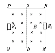 (10分)如图,PN与QM两平行金属导轨相距1 m,电阻不计,两端分别接有电阻R1和R2,且R1=6 Ω,ab导体的电阻为2